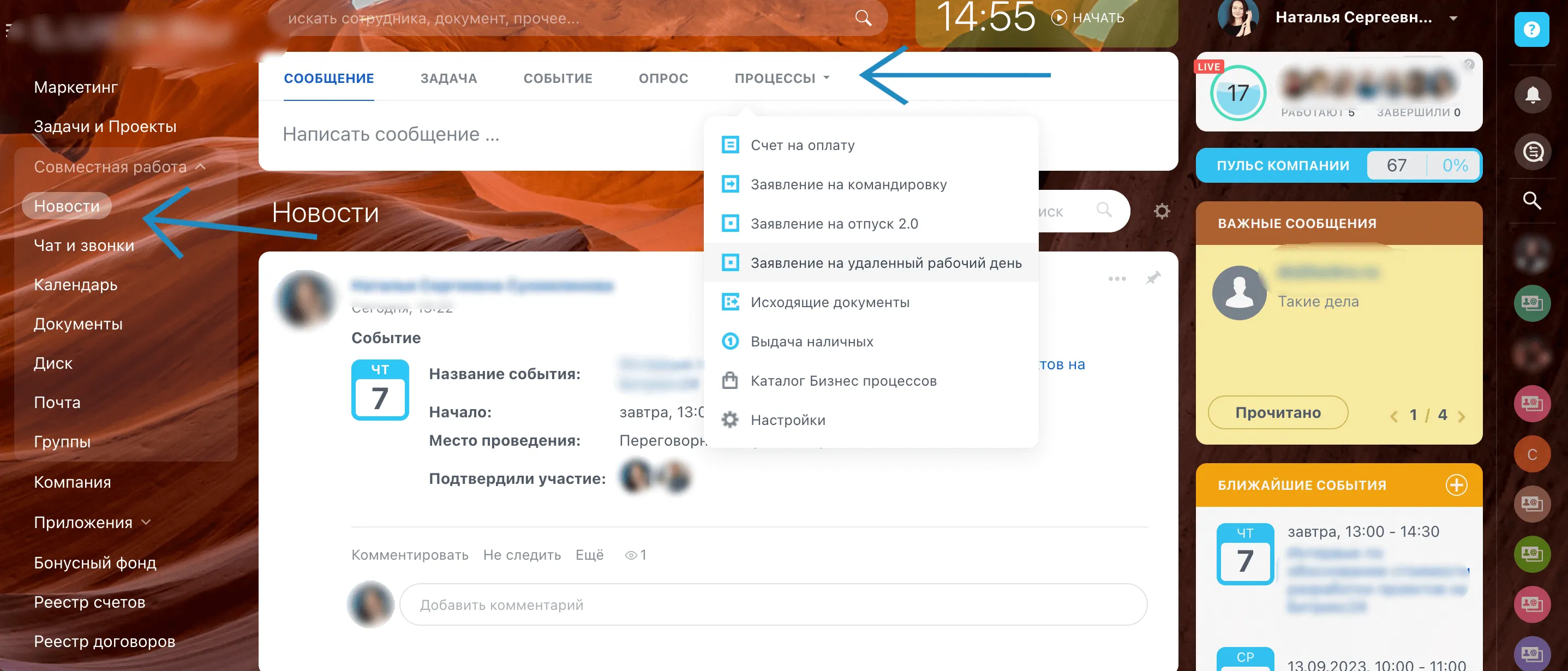 Частый запрос сотрудников — видеть все задачи, заявки и проекты в одном месте. Чтобы посмотреть сроки (которые «горят»), запланированные мероприятия, встречи, заходят в разные части системы: