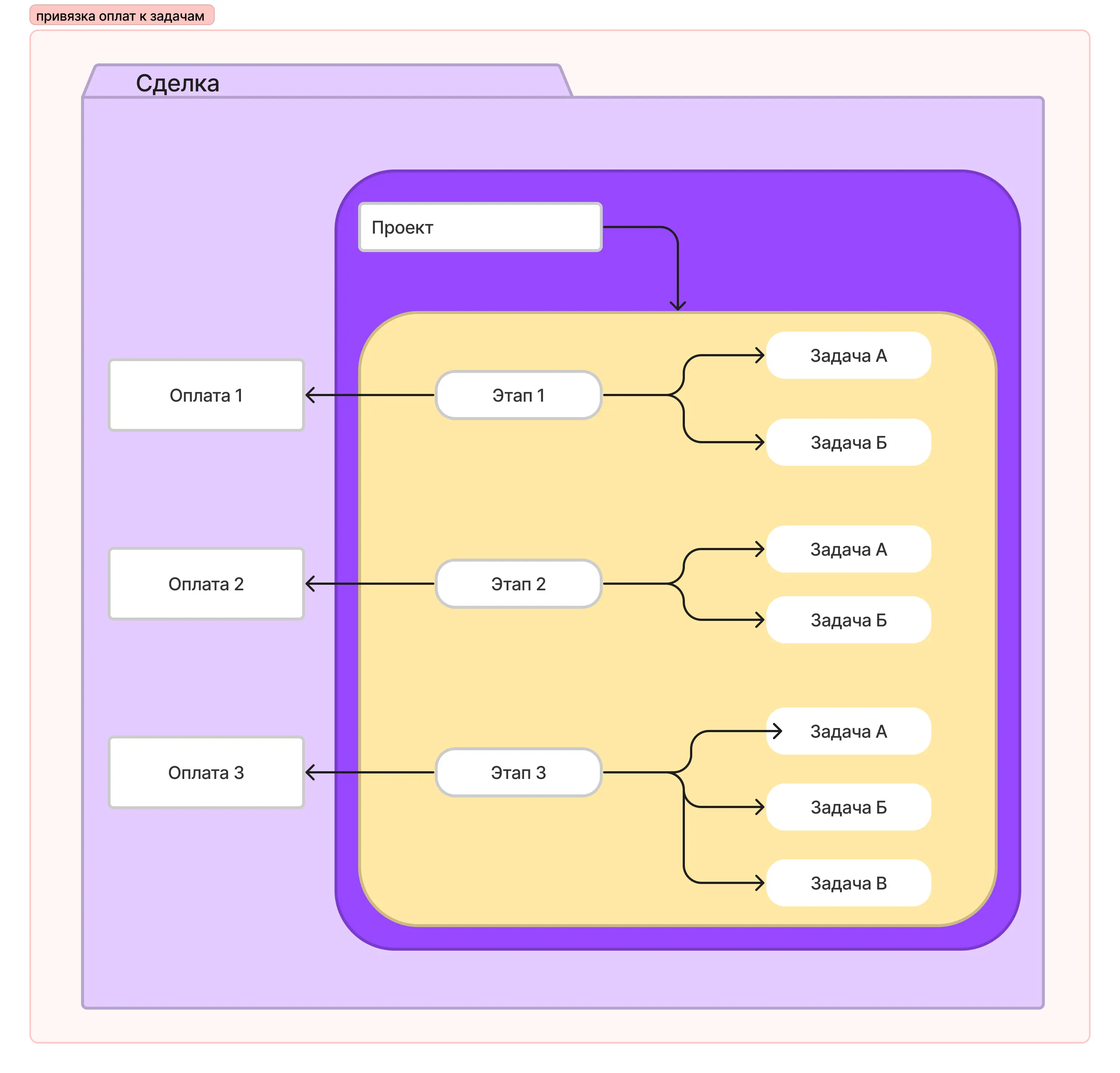 Еще один актуальный пример по учету всех оплат. В Битрикс24 есть сущность «Сделка», где мы создали вкладку «Проект» (это предмет сделки). Проект в свою очередь делится на этапы, а они на задачи. Оплаты в сделке могут быть множественными: можно создать в рамках одной сделки несколько плановых и фактических оплат. У нас несколько этапов в проекте и несколько оплат в сделке, но система не знает как их соотнести друг с другом. Поэтому у нас есть поле, в которым мы должны выбрать к какому из этапов сделки соответствует этап оплаты.