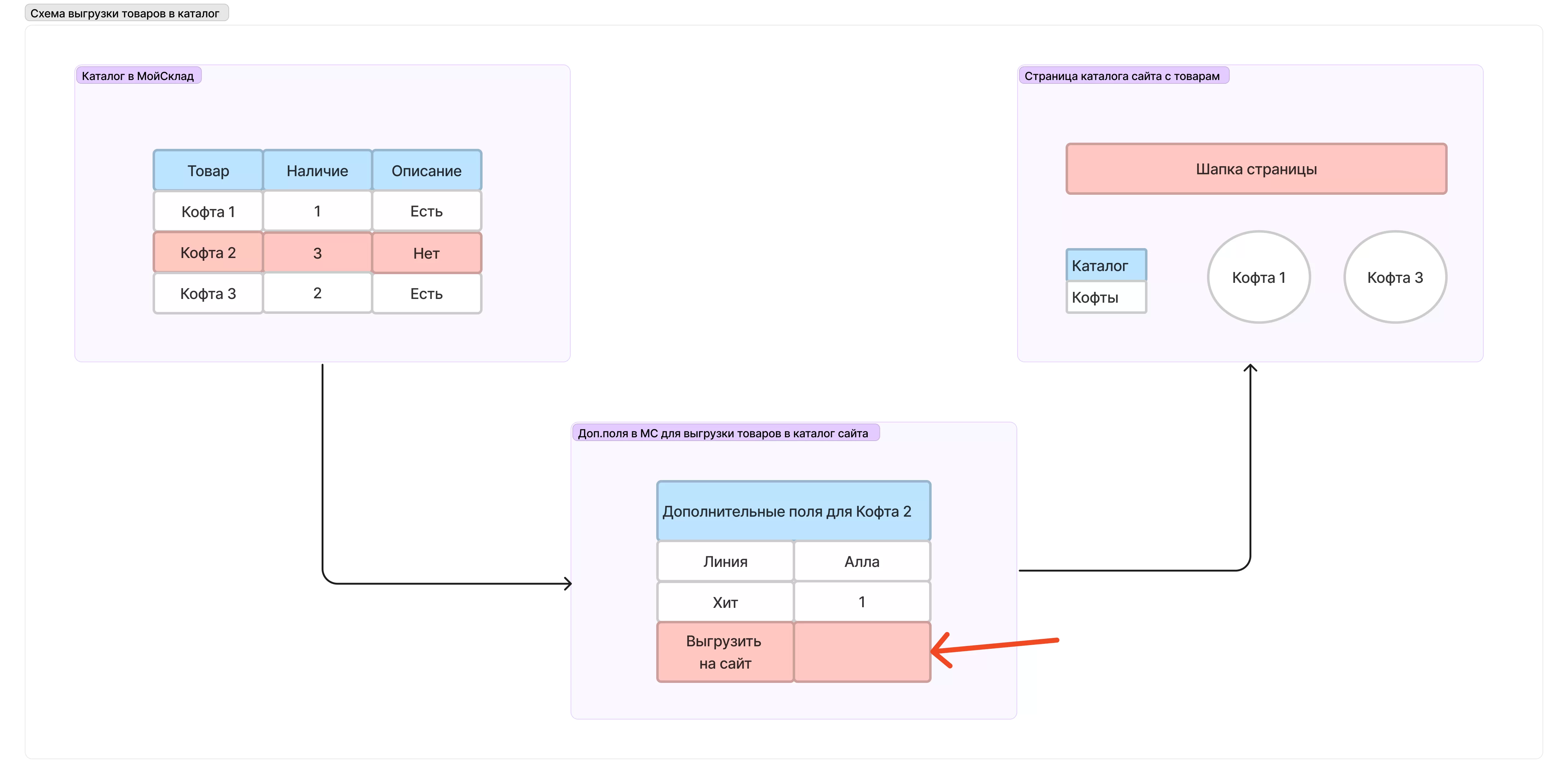 Когда в МС создают каталог товаров, то он полностью дублируется на сайте. В каталоге может быть много разделов, но есть 3 основные для клиента: аксессуары, взрослым, детям. Теперь представьте: в МС создали разделы, которые не нужно сейчас показывать на сайте, но и удалить из каталога в МС нельзя (потом понадобятся в работе). К сожалению, на данный момент, в МС нельзя «отключить» отдельные разделы из выгрузки на сайт. Они все будут автоматически «подтягиваться» в каталог и клиенты увидят пустые (неактуальные) разделы.