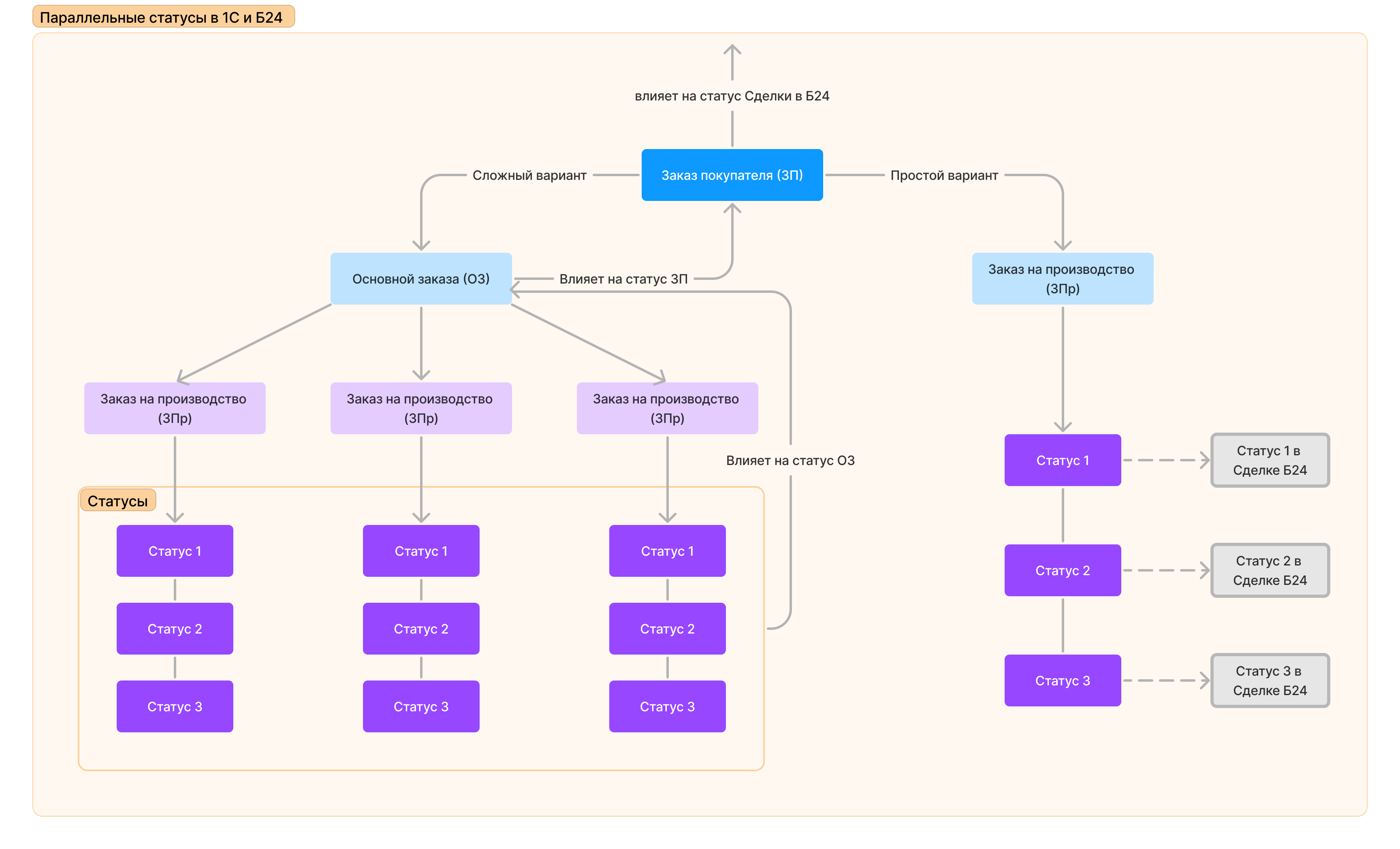 В таком случае на базе ЗП делаем Основной Заказ (далее — ОЗ), и уже на его основе сотрудник создает несколько ЗПр. Когда статусы у ЗПр меняются, то меняется статус ОЗ, а от него по цепочке меняется и статусы у ЗП и Сделки.