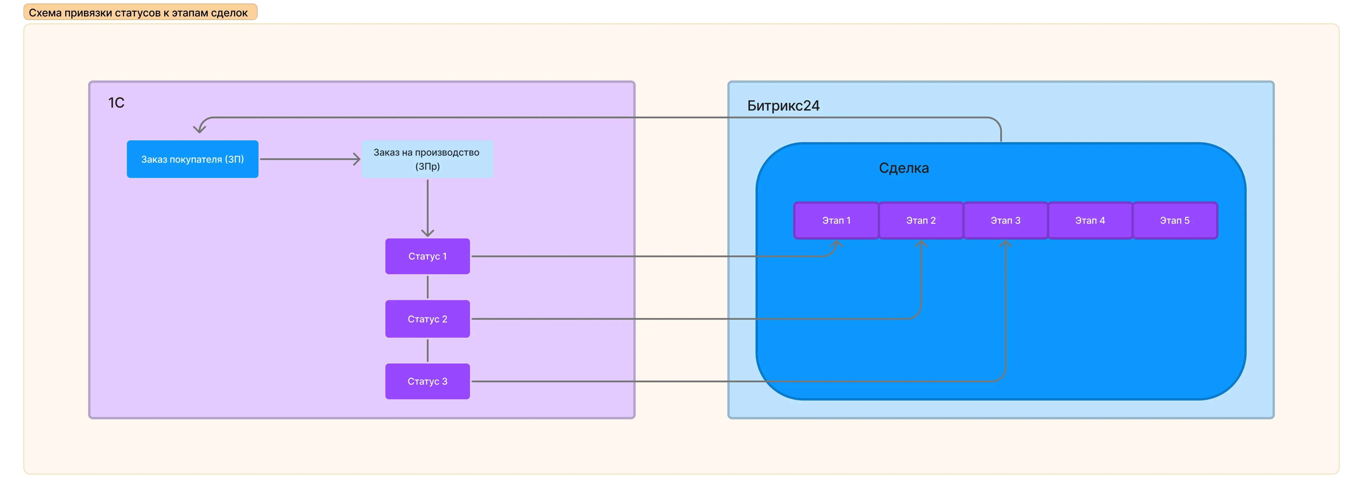 - перемещать автоматически Сделку в Битриксе в зависимости от статусов ЗПр.