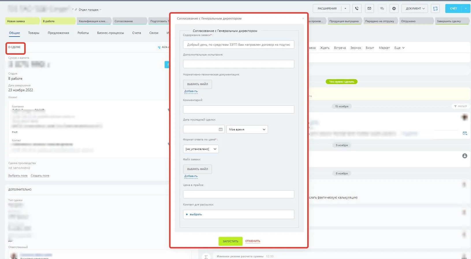После изучения клиента, заказчик запускает процесс согласования Сделки. Мы доработали форму запроса дополнительной информации для согласования заявок. В ней прикрепляется файл с деталями из Сделки, которые нужны сотруднику, чтобы рассмотреть заявку. Для каждого варианта согласования(см.выше) своя форма. При необходимости можно внести дополнительную информацию.