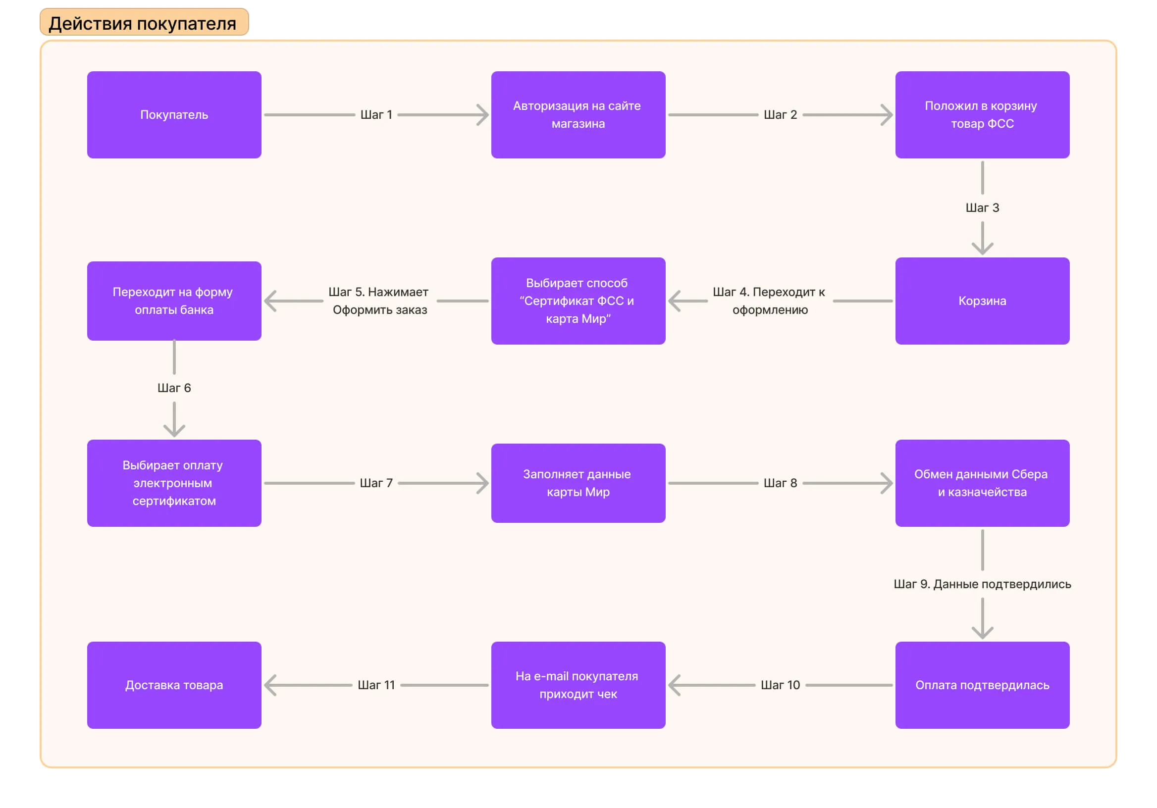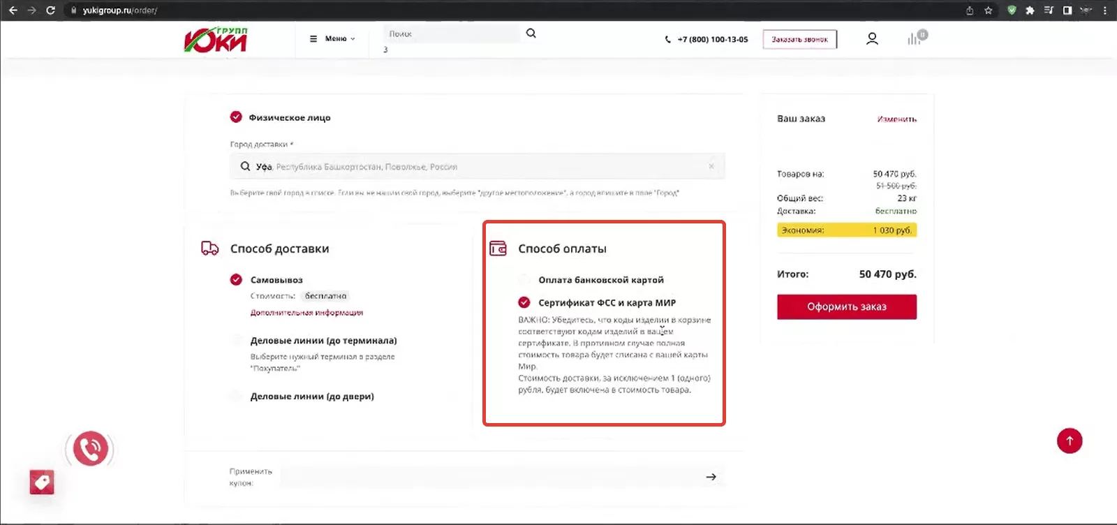 Когда покупатель выбирает товар ФСС и переходит в корзину, то видит два способа оплаты: банковской картой и сертификатом ФСС + карта Мир. Это происходит, если соблюдаются два условия: покупку оформляет физическое лицо и у товара есть метка ФСС. Он выбирает нужный вариант и нажимает кнопку «Оформить заказ». После этого покупатель переходит на форму оплаты, и выбирает тот блок, который относится к сертификату ФСС. Там он заполняет данные карты Мир, которая привязана к этому сертификату.