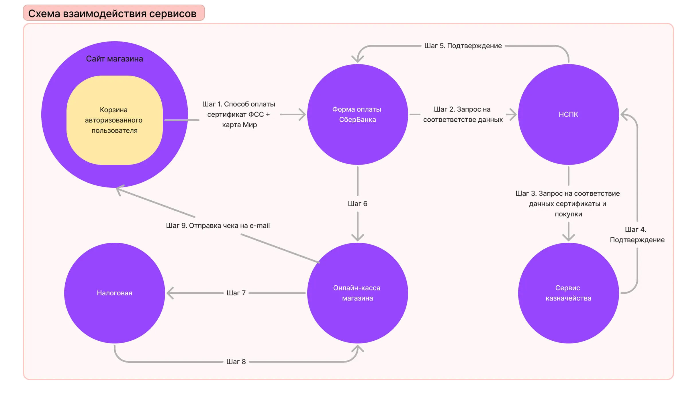 Теперь начинается скрытый от глаз покупателя процесс. Сервис банка передает сервису казначейству запросы и сведения о том, что покупатель хочет приобрести определенный товар на деньги конкретного сертификата. Если все верно, то от сервиса казначейства приходит ответ, что все хорошо и деньги можно перечислить. При этом сам сертификат привязывается к банковской карте Мир, но на нее казенные деньги не зачисляются. Если все сходится, то банк переводит средства на счет магазина.