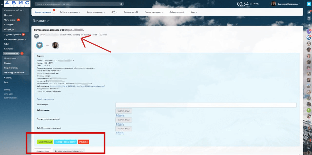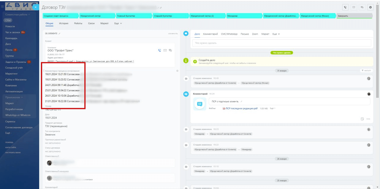 Мы упростили логирования для заказчика. Так как в основе процесса согласования лежит смарт-процесс Битрикс24, то автоматически создаётся карточка сущности. В данном случае карточка документа, где пошагово указано, кто, когда и что вносил в документ. Сотруднику не надо искать и мониторить журнал БП, чтобы понять, кто оставил комментарий к договору. Достаточно зайти в карточку, где это будет указано.