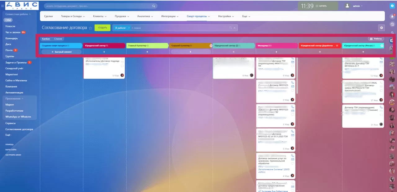 Мы предложили настроить бизнес-процесс «Согласование договора» в связке со смарт-процессом. В этом случае такие процессы попадают на доску Канбан, где можно отследить на каком этапе согласования, у какого сотрудника тот или иной документ. Это решение было связано со следующей дополнительной функцией для клиента ↓