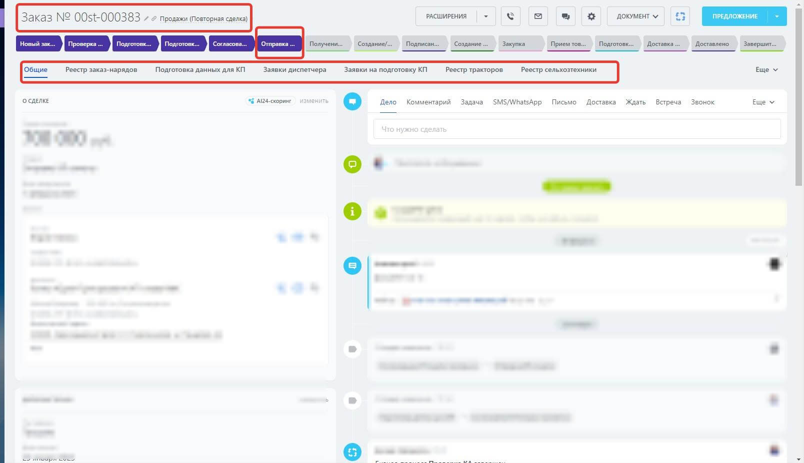 Процесс формирования и согласования КП состоит из нескольких этапов. Поэтому мы разработали несколько вкладок в сущности Сделка (по сути для учета каждого этапа): Подготовка данных для КП; Заявки на подготовку КП; Реестр тракторов; Товары; Реестр сельхозтехники; Предложения и другое.