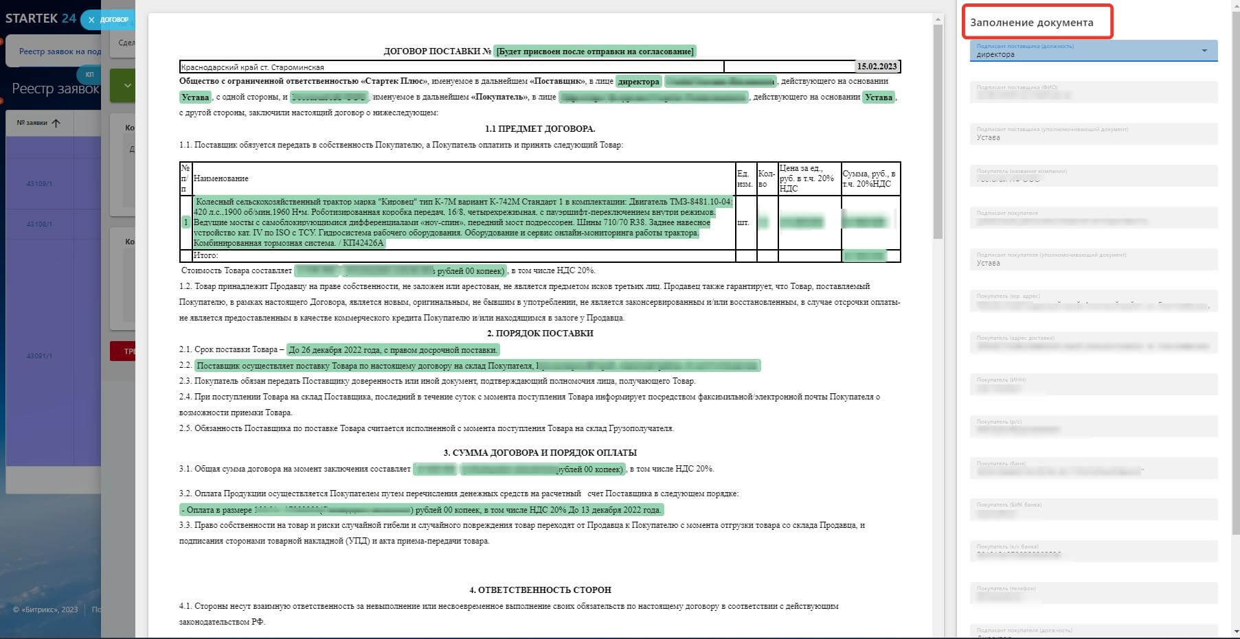 В конструкторе коммерческого предложения, которое уже согласовано, есть переход на стадию Договора. Они бывают разные и есть возможность выбрать шаблон, который подходит в конкретном случае. Его особенность (как и конструктора КП), в том что данные автоматически подтягивается из коммерческого предложения. Для полей, которые автоматически не заполняются, есть справочник с динамическими полями. В нем сотрудник выбирает нужные данные и сохраняет готовый документ.