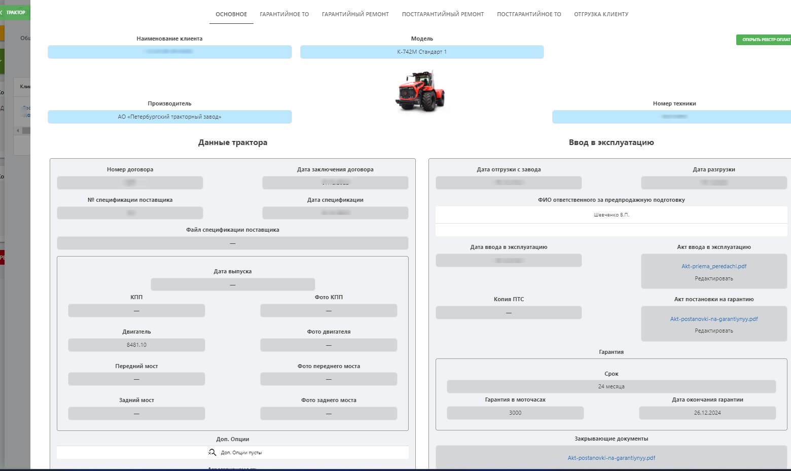 После того, как Договор согласовали, сотрудник вносит данные по товарам в реестры тракторов и сельхозтехники. Так формируется база из тракторов и техники, которые когда-либо поставлял, ремонтировал и обслуживал Стартек. Они «привязываются» в системе к сделкам и клиентам. Сотрудники могут нажать на любое значение в карточках и посмотреть детальную информацию.