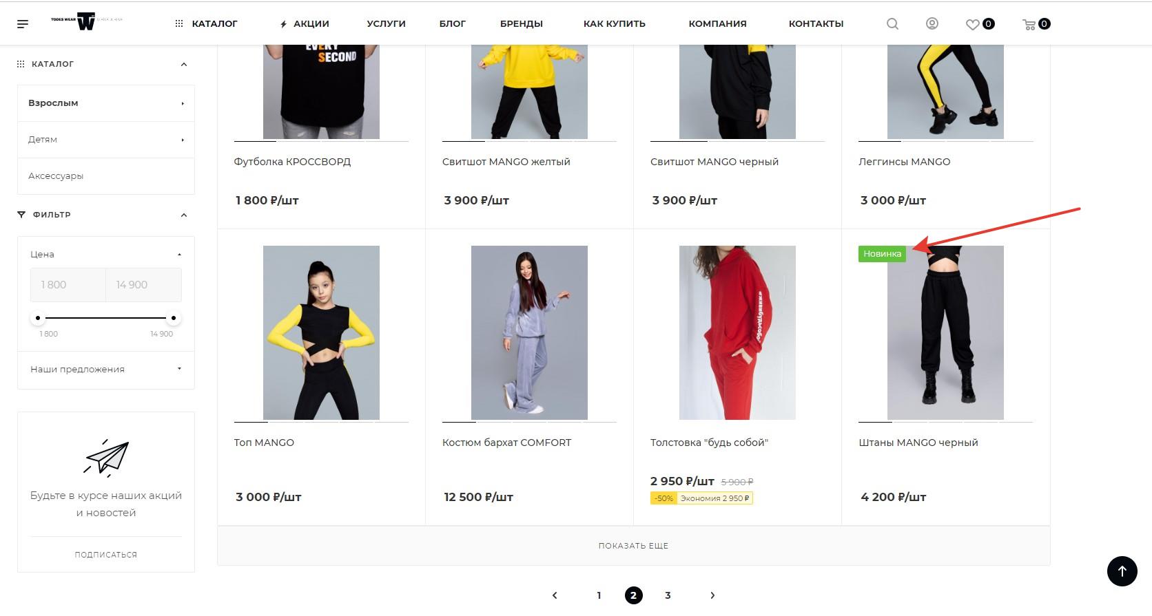 Метка «Новинка» работает по похожему принципу, но немного по-другому. Система сайта самостоятельно (без участия менеджера) мониторит дату создания товара. Если товар добавили меньше 3х недель назад, то система автоматически проставляет товару «Новинка». По прошествию 3х недель, система также автоматически снимает метку. Такая функция оптимизирует работу сотрудников: не дает совершить ошибки и сохраняет время.