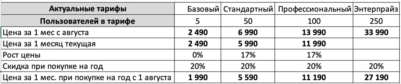 Да, Стоимость его вырастет на 17%, как у большей части тарифов, но безлимит по количеству пользователей одна их веских причин, по которой имеет смысл приобрести этот тариф до конца июля, ведь тарифа с неограниченным количеством пользователей в ближайшей перспективе скорее всего не будет.
