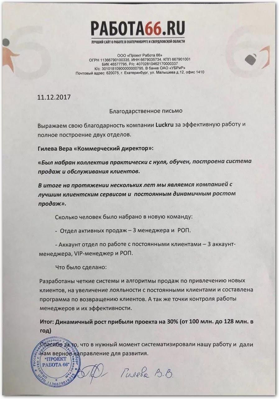 Уважаемый Руслан Викторович, настоящим письмом выражаем благодарность и признательность за профессионально проделанную работу командой LUCKRU.