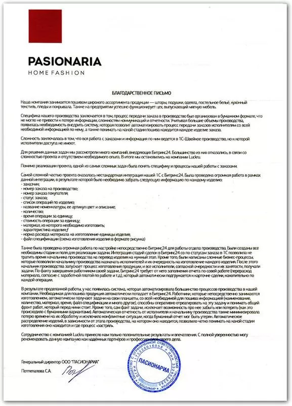 Сотрудничество с компанией Luckru принесло нам только положительные результаты и впечатления. С полной уверенностью могу рекомендовать данную кампанию как надёжных партнёров и профессионалов своего дела.ПОТПЕЛОВА С.А., Генеральный директор ООО "ПАСИОНАРИА"