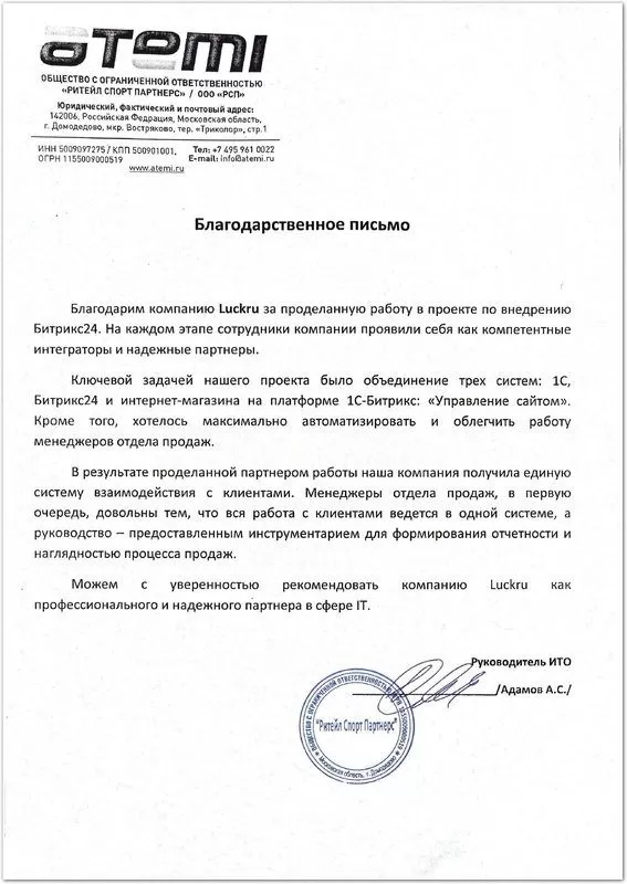 Благодарим компанию Luckru за проделанную работу в проекте по внедрению Битрикс24. На каждом этапе сотрудники компании проявили себя как компетентные интеграторы и надежные партнеры.Адамов А.С., руководитель ИТО компании Atemi