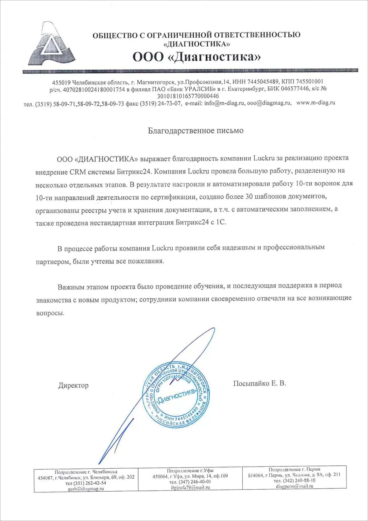В процессе работы компания Luckru проявили себя надежным и профессиональным партнером, были учтены все пожелания.Посыпайко Е. В., директор ООО «Диагностика»